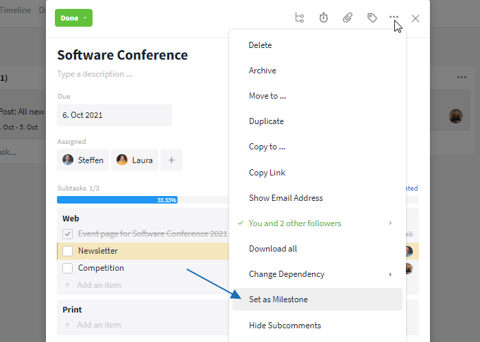 Alternatively, you can convert existing tasks into milestones. Simply open the corresponding task, click on the More button (symbol: three dots) in the upper right corner, and select the option "Set as Milestone".