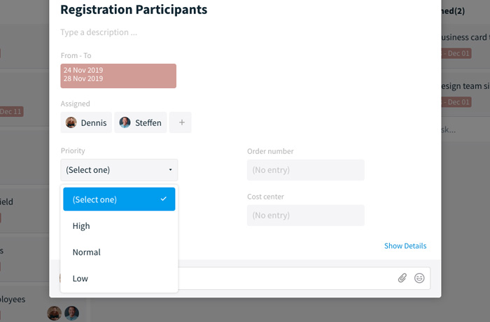 Last but not least, we will look at features that allow us to design tasks even better in the future. If desired, so-called "custom fields" can be defined for selected rooms - e.g. for important intermediate appointments, the extension number of an important contact person or drop-down lists with priorities, team assignments, etc. These individual input fields will be added to all task cards of a room.