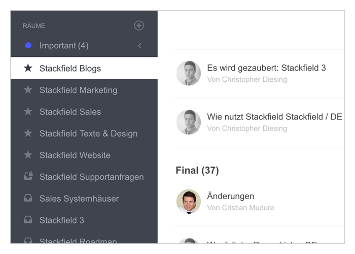 Erfahrungsgemäß unterscheidet sich unsere interne Nutzung etwas von der Nutzung durch unsere Kunden: Während diese meist projektbezogen bzw. in Themengebiete unterteilt arbeiten, haben wir auf Stackfield für jede Abteilung einen eigenen Raum erstellt. So existiert ein Raum für den Support, ein Raum für die Buchhaltung, ein Raum für die Entwicklung der Web-App, ein Raum für die Entwicklung der iOS-Mobile-App, usw. - hierüber wird die tägliche Teamarbeit abgewickelt. Da wir allerdings zusätzlich auch größere Projekte, wie z.B. Updates, die eine gewisse Vorarbeit benötigen, absolvieren, steuern wir diese Projektarbeit in einzelnen Räumen. Somit findet die Unternehmenskommunikation und Kollaboration entweder in größeren oder kleineren Teilbereichen statt.