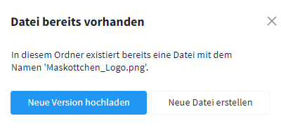 Ist beim Hochladen einer Datei bereits eine Datei mit gleichem Namen (auch die Endung für den Dateityp muss identisch sein) vorhanden, öffnet sich ein Dialogfenster. Nun kann entweder die alte Datei durch eine neue Version ersetzt oder die hochzuladende Datei umbenannt werden. Alternativ kann der Vorgang über "X" abgebrochen werden. Unterscheidet sich eine der Komponenten des Namens, wird die Datei als neue Version hochgeladen und separat gespeichert.