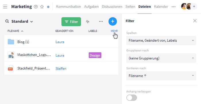 Dateien werden als Liste für alle befugten Mitglieder dargestellt. Standardmäßig werden dabei nur der Titel und Dateityp angezeigt. Es können allerdings weitere Informationen (wie z. B. Labels und Größe) über die "Mehr"-Schaltfläche in der Übersicht oder im Filter unter "Spalten", eingeblendet werden. Zur strukturierten Ablage der Dateien können auch Ordner angelegt werden.
