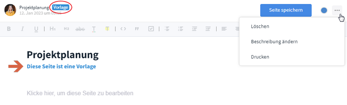 Bei einer Seite weist ein blauer Hinweis unter dem Titel der Seite darauf hin, dass es sich um eine Vorlage handelt ("Diese Seite ist eine Vorlage") und es erscheint ein zusätzlicher Hinweis oben rechts neben dem Titel (blauer Button: "Vorlage"). Bei einem Whiteboard erscheint nur der Hinweis oben rechts neben dem Titel. Steht unter / neben dem Titel kein blauer Hinweis, wurde nicht die Vorlage geöffnet, sondern eine neue Seite / ein neues Whiteboard aus der Vorlage erstellt.
