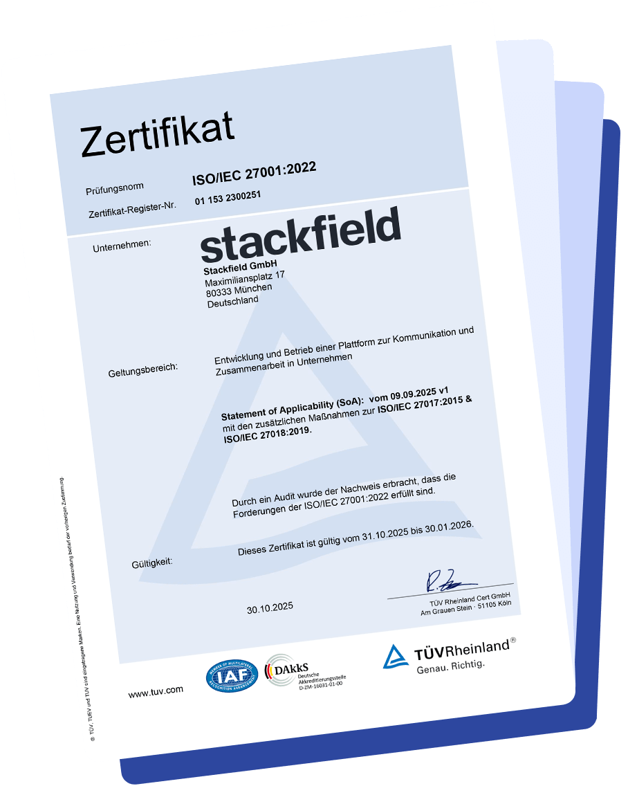 Die Zertifizierung zeigt, dass die Stackfield GmbH das Thema Informationssicherheit in allen Bereichen, Prozessen und Szenarien, egal ob Kundensupport oder Katastrophenfall, berücksichtigt und angemessene Lösungen für etwaige Risiken implementiert hat.