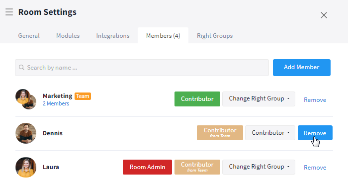 Room Admins can remove users or entire teams from the room via the tab Members within the "Room Settings". Simply click on the button "Remove" next to the respective user or team. Room Admins can also remove themselves from the room here.