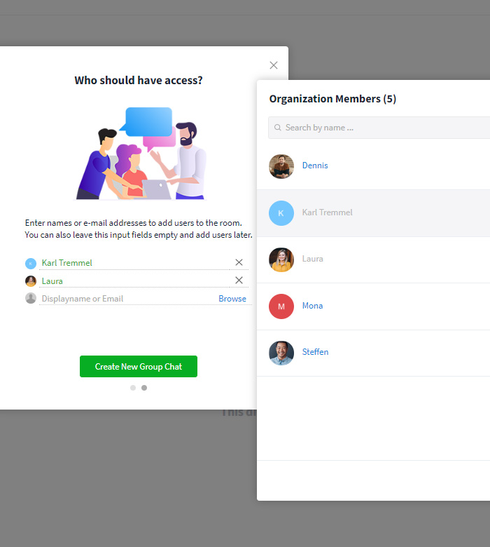 Note: You can also add new members directly in group chat: Click on the participant listing in the upper right corner of the view and select "+ Add User".