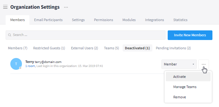 To reactivate a deactivated user, switch to the tab Deactivated in the "Organization Settings" and click on the More button (symbol: three dots) next to the user which you want to reactivate. Now, choose the option "Activate." Finally, all previous functions are available to them again. The access to all old rooms remains, thus the user does not have to be re-added.