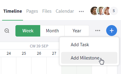 New tasks and milestones can be created in the schedule module by clicking on the blue plus symbol and selecting the corresponding option.