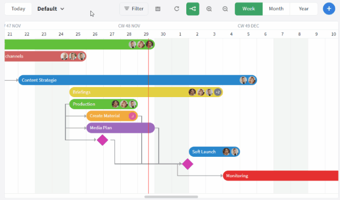 Dependencies act as a link between individual or multiple tasks i. e. milestones. They are intended to ensure that interdependencies are taken into account and indicate the effects that changes to the schedule will have. This allows you to plan the optimal process and the fastest route through the upcoming activities.
