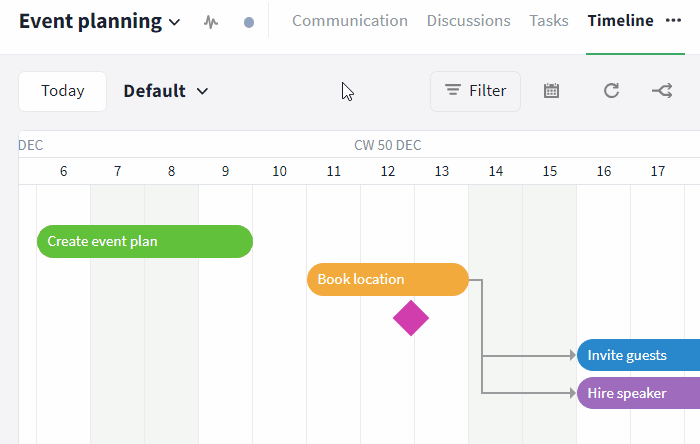 The Stackfield modules are interlinked and interconnected. Tasks / milestones (see "Basics" for the meaning and visualization) can be created, changed or deleted in various ways, but they only appear in the schedule when a due date is assigned.