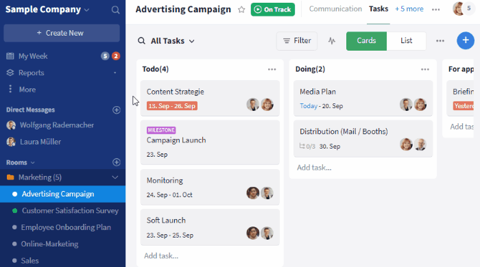 When grouping tasks according to their status, the open standard statuses (Todo, Doing, For approval, ReOpened) are displayed first, then the individual statuses alphabetically and finally "Done" due to possible individual / different arrangements within the various rooms.