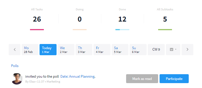 Once the poll is created, all participants in the room* will receive a notification in My Week inviting them to participate in the poll. By clicking "Participate" you will be redirected to the poll. If you do not want to participate directly or not at all, click on "Mark as read". The notification will then be removed from My Week.